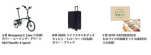 簡単に持ち運べる折りたたみ自転車の「Brompton C Line」、MINIオリジナルの「キャビン・トローリー」、ものづくりが体験できるSOW EXPERIENCEの「カタログギフト」。