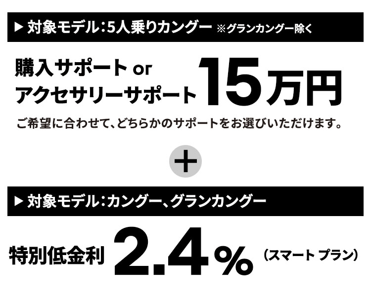 期間中、対象モデルを新車でご成約かつご登録いただいたお客様に、15万円のアクセサリーサポートまたは購入サポートを提供いたします。さらに、3月31日(火)まで対象モデルを新車でご成約いただいたお客様に、2.4%特別低金利(スマート プラン)を提供いたします。